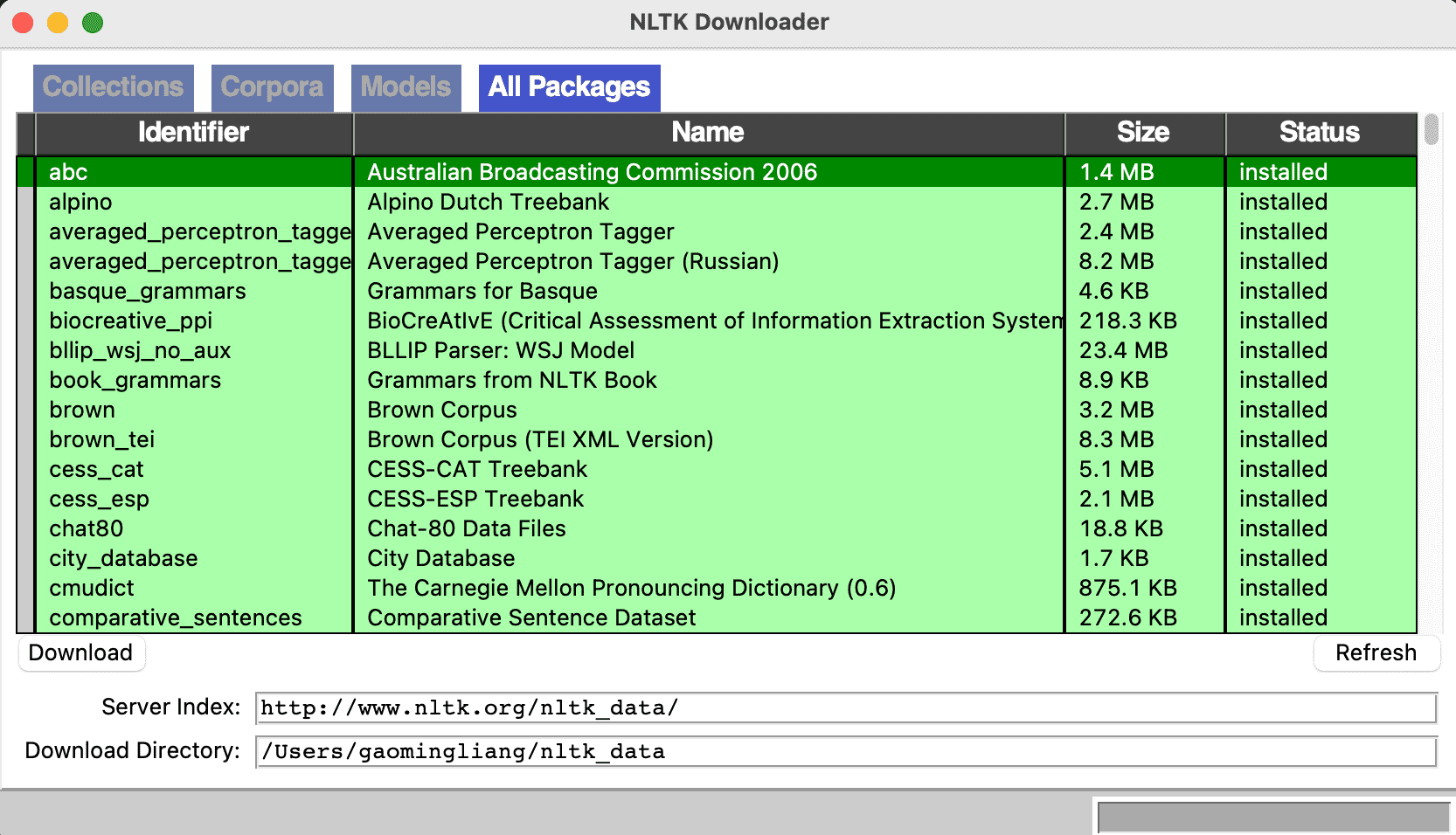 在GUI Downloader上,更换Server Index地址:http://www.nltk.org/nltk_data/
