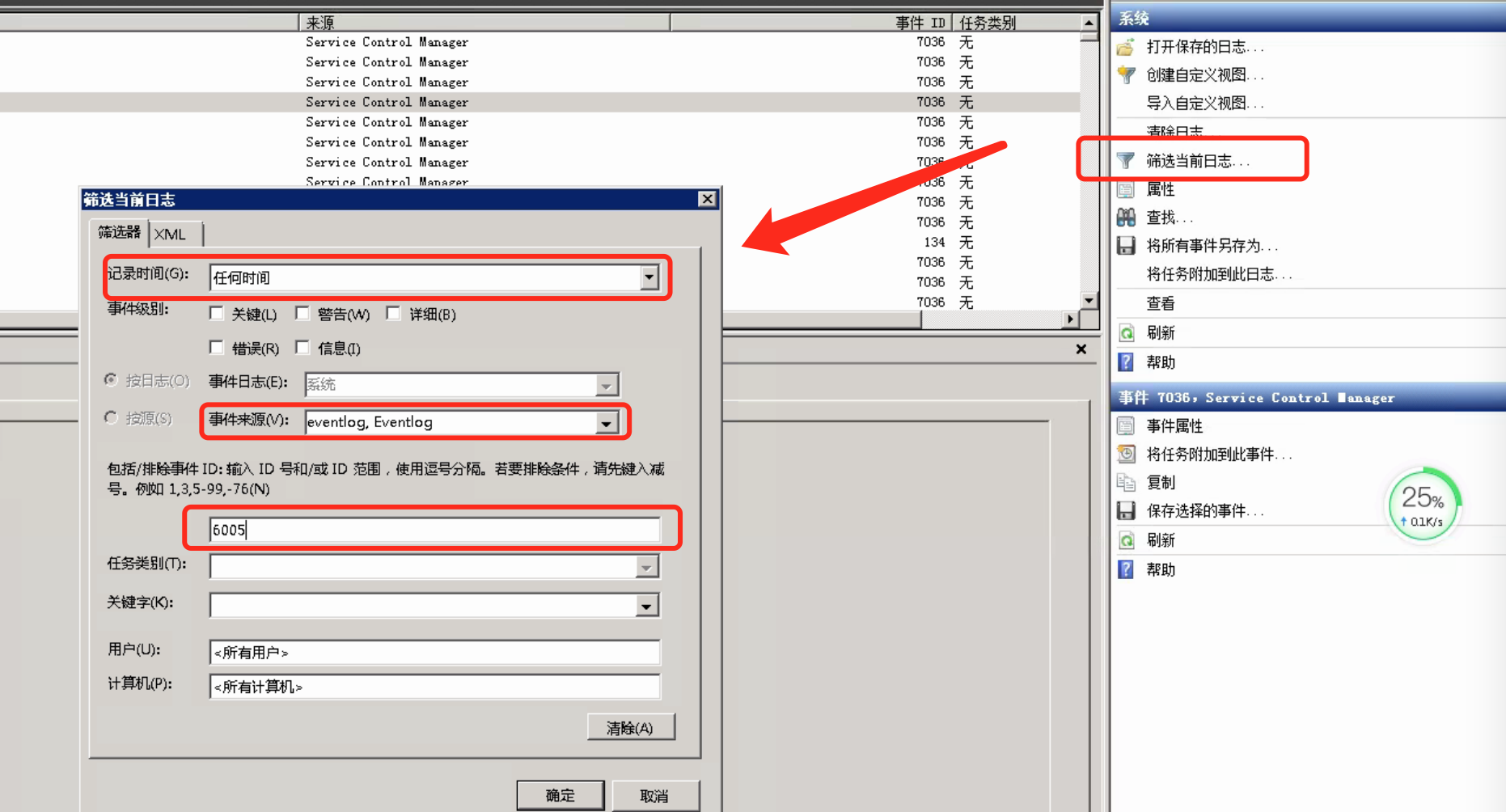 - 功能区:对EventLog的常用功能,主要用到筛选当前日志
